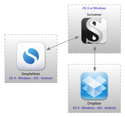 Every time I end a writing session in Scrivener I make sure I synchronize the Scrivener project with SimpleNote so that if I find myself sitting at a Starbuck’s or waiting in an airport, I can pickup my iPad and continue working on my writing project. Anywhere, anytime.